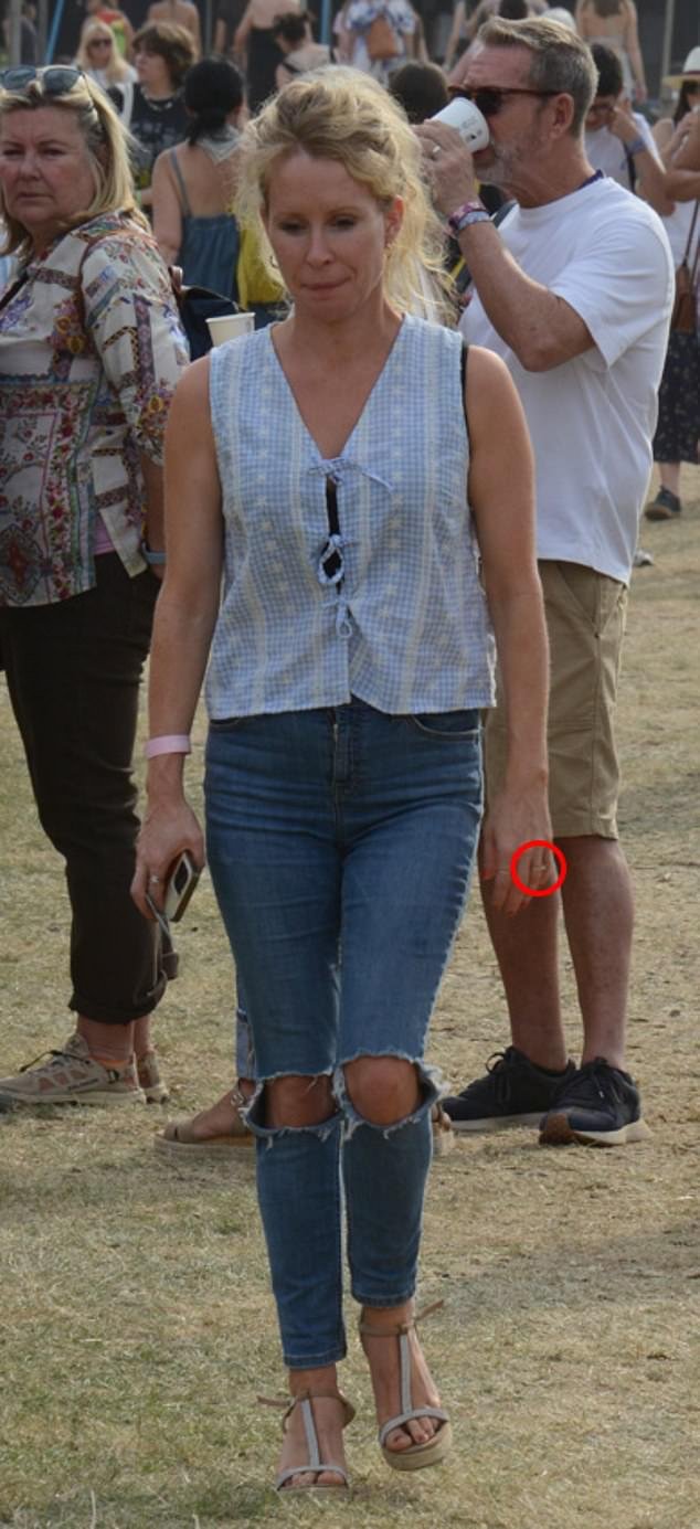 No hizo ningún intento de ocultar la banda de oro con tres diamantes brillantes (arriba) cuando apareció en el Big Feastival en los Cotswolds el domingo pasado