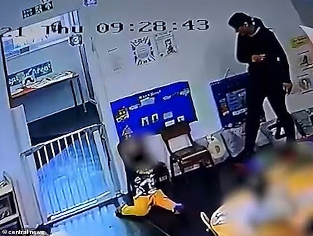 Su colega Tariq también fue atrapado en CCTV golpeando la cabeza de un niño autista con un teléfono móvil antes de patearlo en la parte de atrás. Luego se lo ve llorando en el suelo.