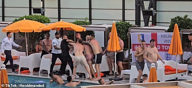 Se puede ver una bandera de Inglaterra colgando en el fondo con las palabras ‘Ash’s Stag 2025, pero no está claro si los hombres involucrados son británicos, o por qué estalló la pelea en primer lugar
