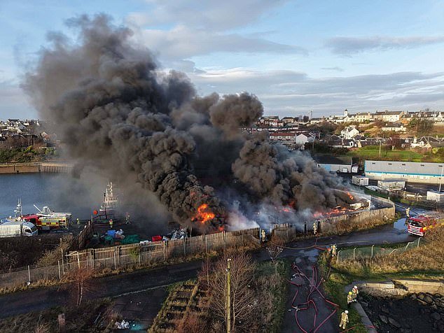 Un incendio que provocó una gran explosión provocó que columnas de espeso humo negro se elevaran sobre el puerto de Methil en Escocia.