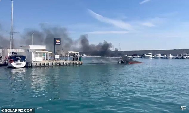 El Ayuntamiento de Fuengirola dijo esta tarde en un comunicado: ‘El servicio de rescate y salvavidas, el departamento de bomberos y la policía local de Fuengirola, así como la Guardia Civil, respondieron hoy a un incendio en un bote navegando en el puerto deportivo, cerca de la boca del puerto.