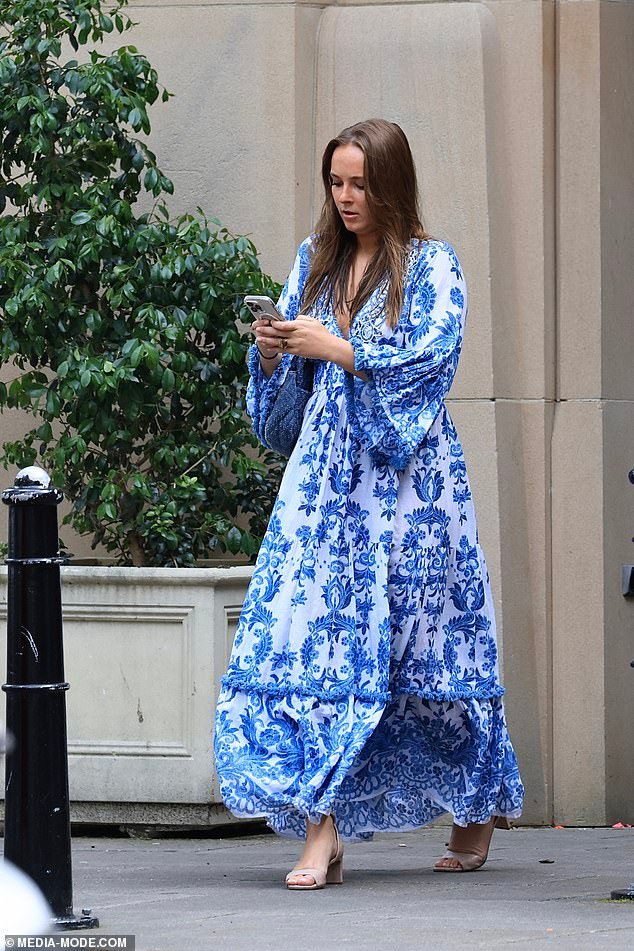 Completó su look con un par de tacones beige y dejó afuera su cabello castaño mientras disfrutaba de un día divertido con amigos.