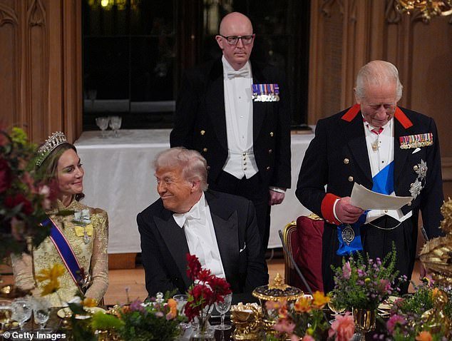 Kate se colocó estratégicamente en el lado derecho de Trump en el extraordinario banquete del estado de Windsor Castle State, con él con él y compartiendo repetidamente sonrisas con él durante la comida.