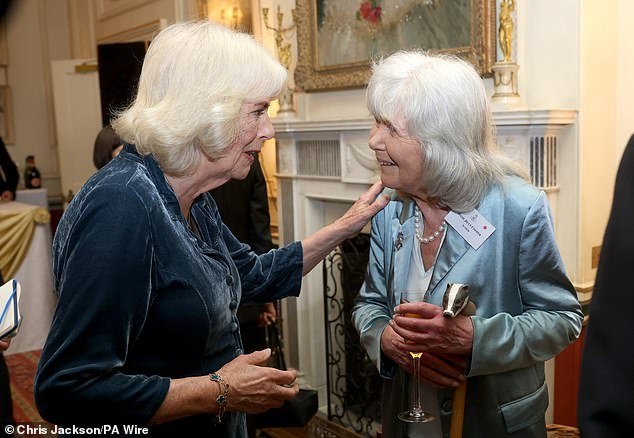 La reina (izquierda) ha rindiendo un homenaje sincero a Dame Jilly Cooper (derecha) después de la muerte del autor a los 88 años: se muestran aquí en una recepción en Clarence House, Londres, en marzo de este año