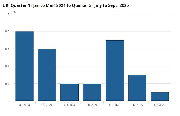 El impulso de crecimiento de Rachel Reeves sufrió otro golpe hoy cuando las cifras mostraron que la economía está cerca de estancarse.
