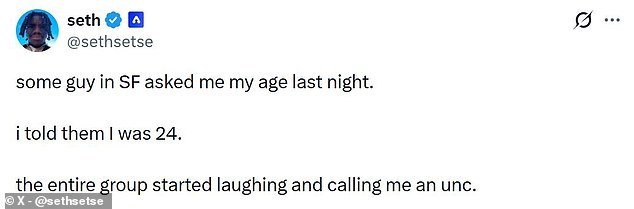 Mientras tanto, un usuario de las redes sociales publicó en Twitter: ‘Un tipo en SF me preguntó mi edad anoche. Les dije que tenía 24 años. Todo el grupo empezó a reírse y a llamarme tío.