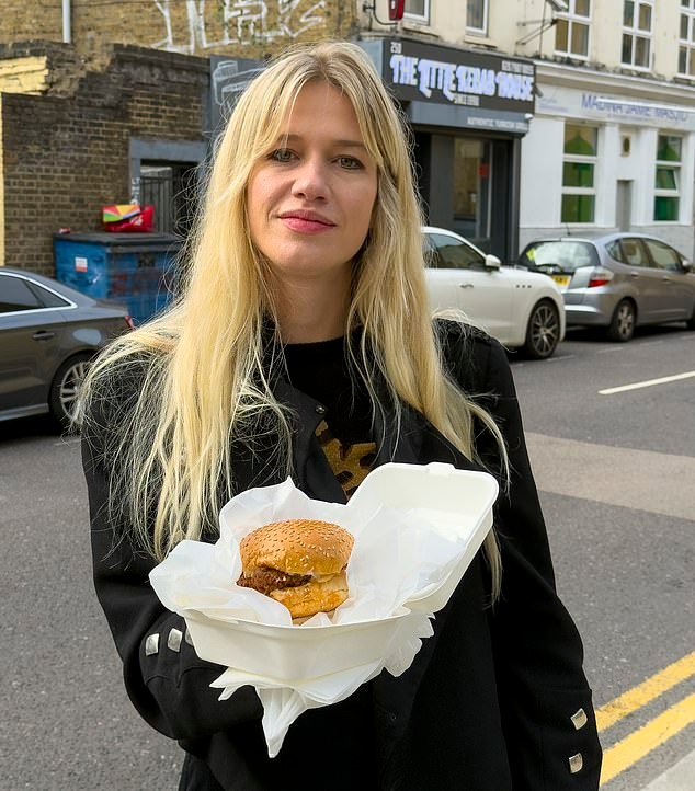 La reportera Lydia Veljanovski con una hamburguesa de pollo Coqfighters creada en The Little Kebab House en Isle of Dogs, al este de Londres