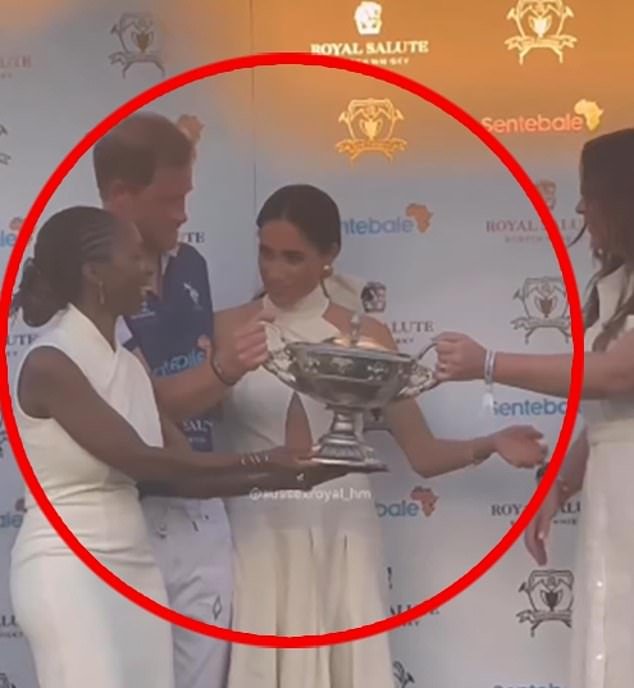 El momento “altamente incómodo” en un partido de polo de recaudación de fondos para Sentebale en los Estados Unidos el año pasado, donde se filmó la duquesa de Sussex, pidiendo al presidente de la caridad Sophie Chandauka (izquierda) que no se pare directamente al lado del Príncipe Harry en la presentación del trofeo.