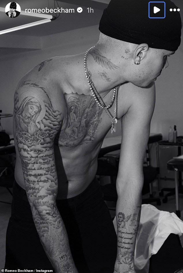 Romeo Beckham ha compartido una nueva foto que muestra su extensa colección de tatuajes mientras parece mantenerse alejado del drama familiar en curso que involucra a su hermano Brooklyn.
