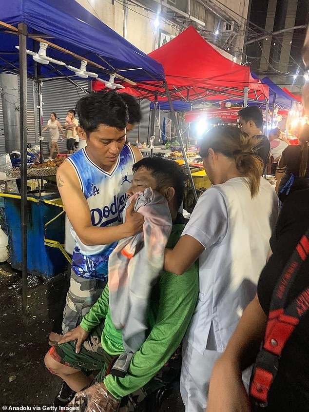 El bombero Rey Cañete dijo que su estación de bomberos se derrumbó en el terremoto, y los primeros auxilios tuvieron que ser entregados a al menos tres residentes, que se lesionaron por la caída de escombros.