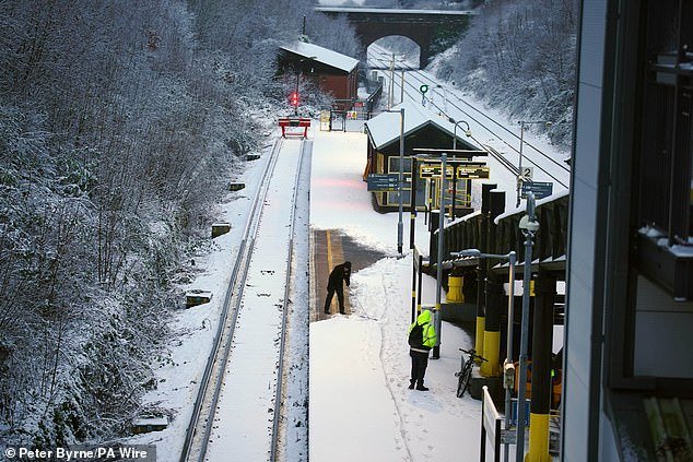 Los trenes fueron cancelados durante el fin de semana después de que los jefes sindicales dijeran a los conductores que no caminaran sobre la nieve (en la foto: estación Hunt’s Cross el domingo)