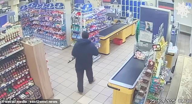 Las imágenes muestran el sorprendente momento en que un hombre armado con un rifle de asalto AK-47 comenzó a disparar en un supermercado ucraniano