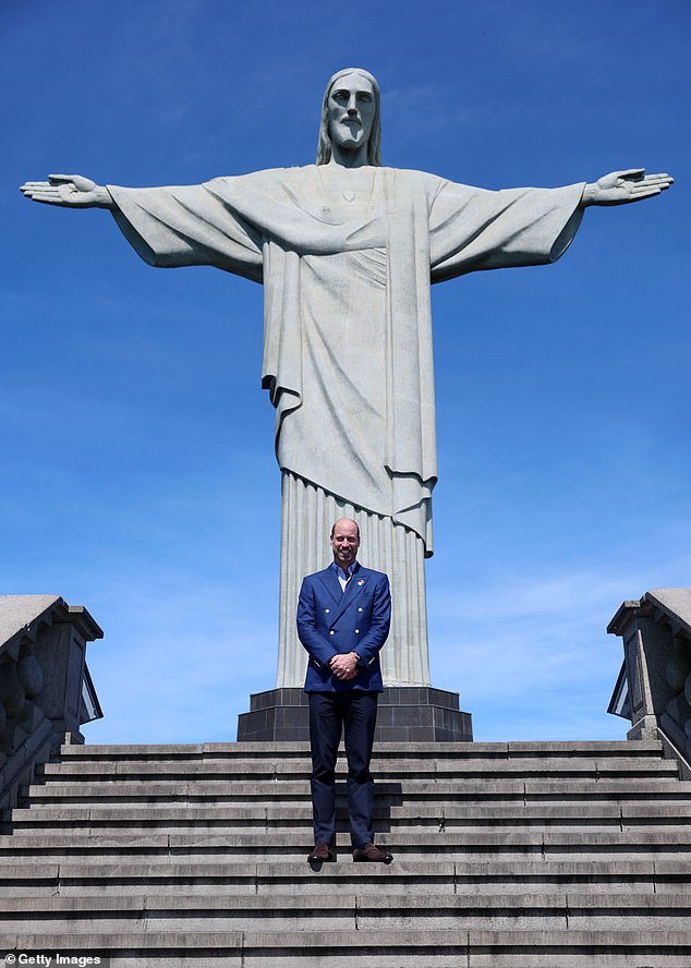 En perfectas condiciones soleadas, William siguió los pasos de su madre mientras viajaba a la cima de la montaña Corcovado en Río para maravillarse ante el monumento de 98 pies de altura.