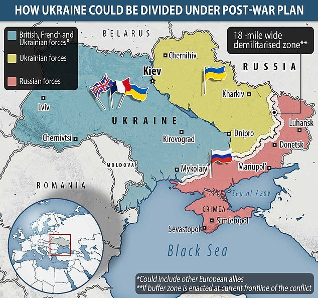 Le dijo al Times que las tropas británicas y francesas que ocupan al oeste del río Dnipro, que corta Ucrania a la mitad de norte a sur y podrían actuar como una línea de demarcación, no sería provocativo en absoluto “para el Kremlin.