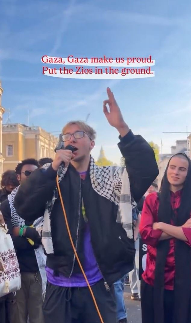 Un estudiante de Oxford (en la foto) fue filmado cantando letras antiisraelíes “horripilantes” ante una multitud en Londres, lo que provocó una investigación policial.