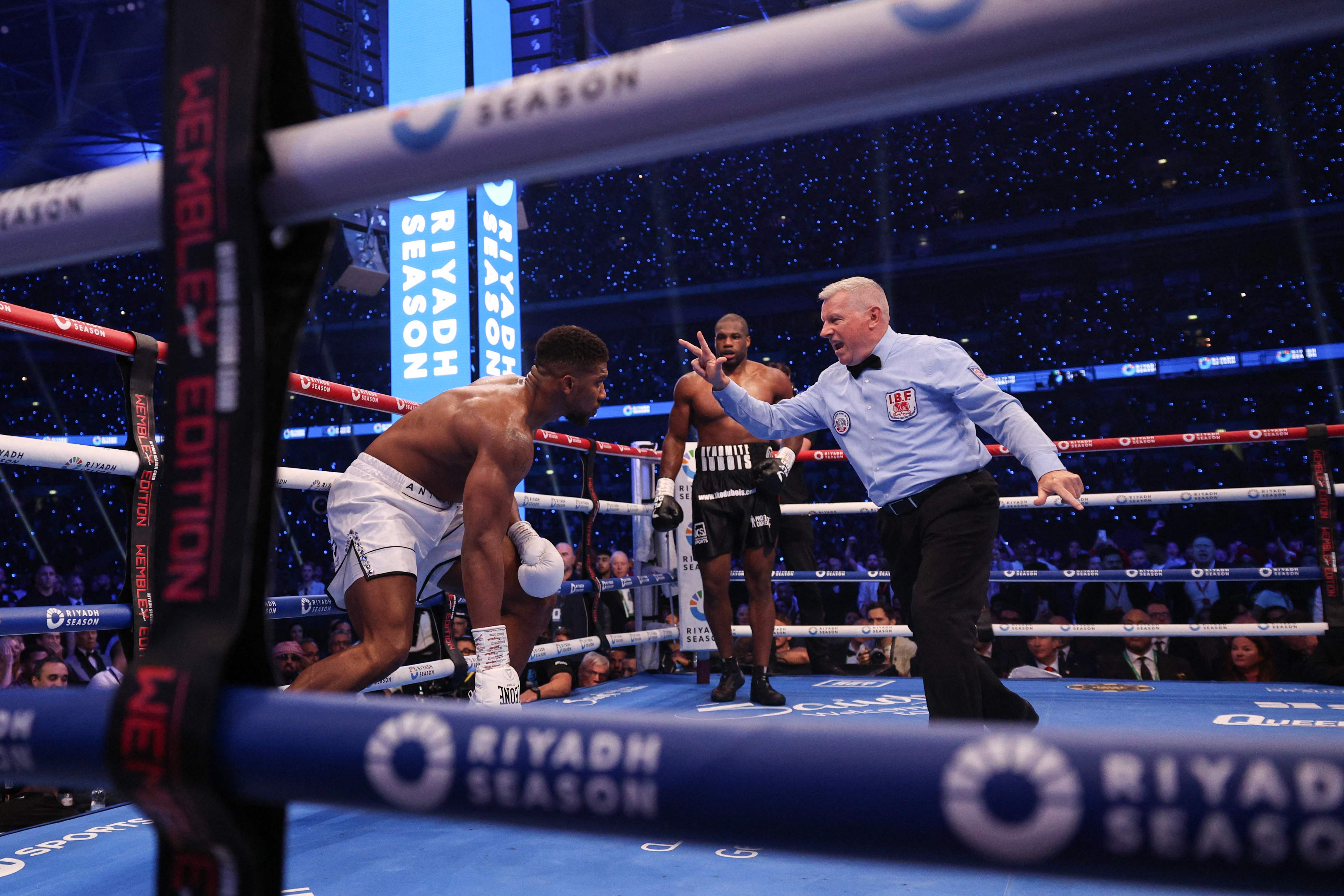 DuBois afirma con razón, Sabe que duele y quiere dormir a AJ. Al campeón le duelen las manos, Joshua se mueve por el ring, Cayendo sobre las cuerdas.