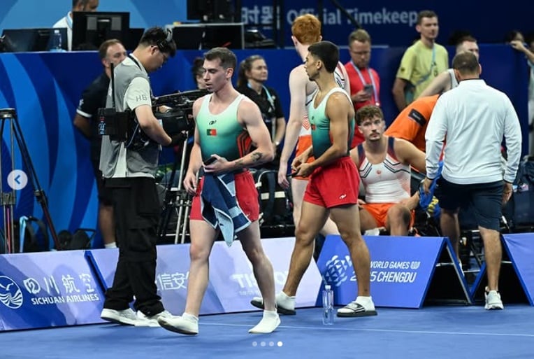 El “castigo” para Santos creó una vida mejor para los portugueses en la gimnasia del trampolín, que es un método para proteger a Santos aún más en la sección de saltos sincronizados. “No es confiable en ganar oro en los juegos mundiales. Sabemos que podemos hacerlo, pero tenemos que darnos todos. Tuvimos un poco de suerte y una medalla de oro que otras. Las personas de trampolín sincronizadas son muy divertidas de ver porque es como un espejo porque estás saltando, hay alguien que salta a la misma altura a tu lado, y es más hermoso que el trampolín individual.