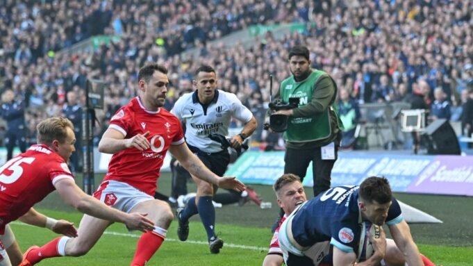 5-3. ¡Artículo de Escocia! El primero del trabajo de Kinghorn es que no se puede detener después de la buena descarga de Darcy Graham. Transforma Finn Russell, después de una mala tarde en la Copa Calcuta.