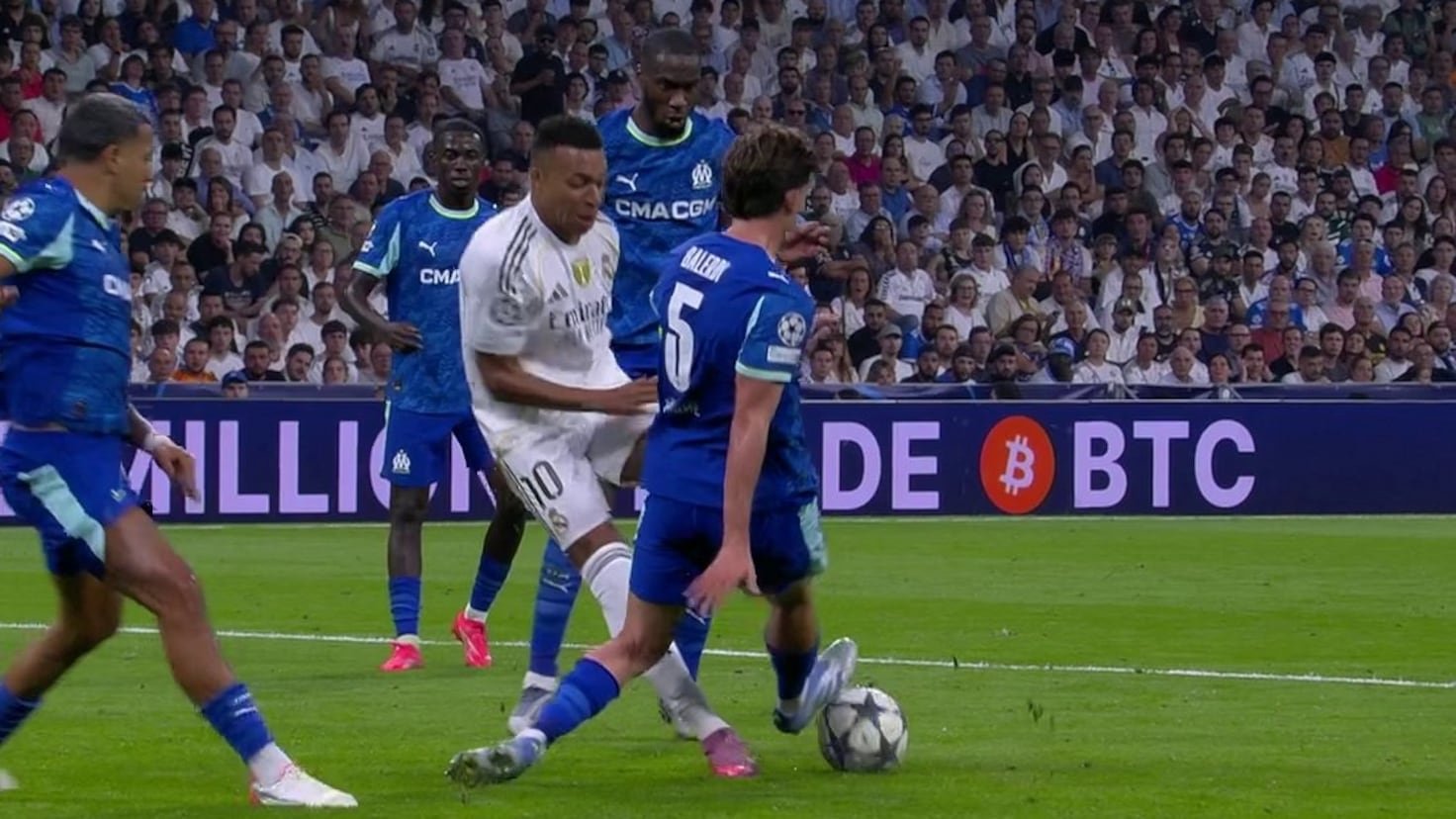 Controversia en Santiago Bernabu. Con 1-1 en el minuto 54 y en el marcador, El Real Madrid Marsey ha multado a Baleti sobre Empapay para entrar al Guardian En el francés con hierro, comuníquese con la pelota, pero con la pierna del delantero de Madrid.