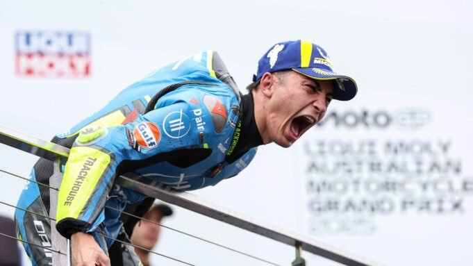El piloto español Raúl Fernández, del victorioso equipo Trackhouse MotoGP, celebra en el podio tras el Gran Premio de Australia de MotoGP en Phillip Island el 19 de octubre de 2025. (Foto de Martin Keep / AFP) / --Imagen restringida a uso editorial - uso estrictamente respetuoso